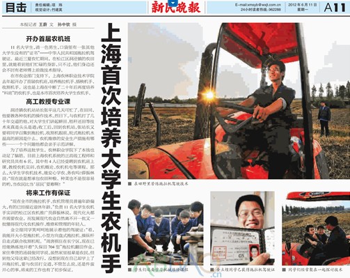 6月11日,新民晚报A11 “目击”版用半版报道了我院培养的大学生农机手“三夏”实训。