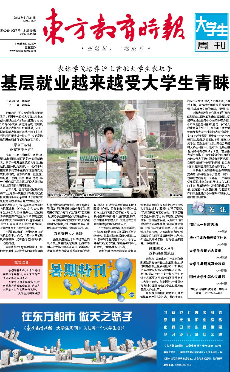 学院培养大学生农机手,在社会上不断引起关注,吸引各类媒体争相报道。6月21日,《东方教育时报·大学生周刊》头版整版报道了我院培养首批大学生农机手,标题为《农林学院培养沪上首批大学生农机手——基层就业越来越受大学生青睐》。