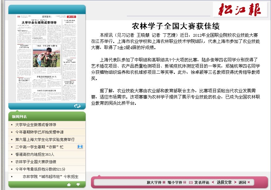 本报讯(见习记者王晓慧记者丁艺婕)近日,2012年全国职业院校农业技能大赛在江苏举行。上海市农业学校和上海农林职业技术学院组队,代表上海市参加了农业技能大赛,取得了3金2银4铜的好成绩。