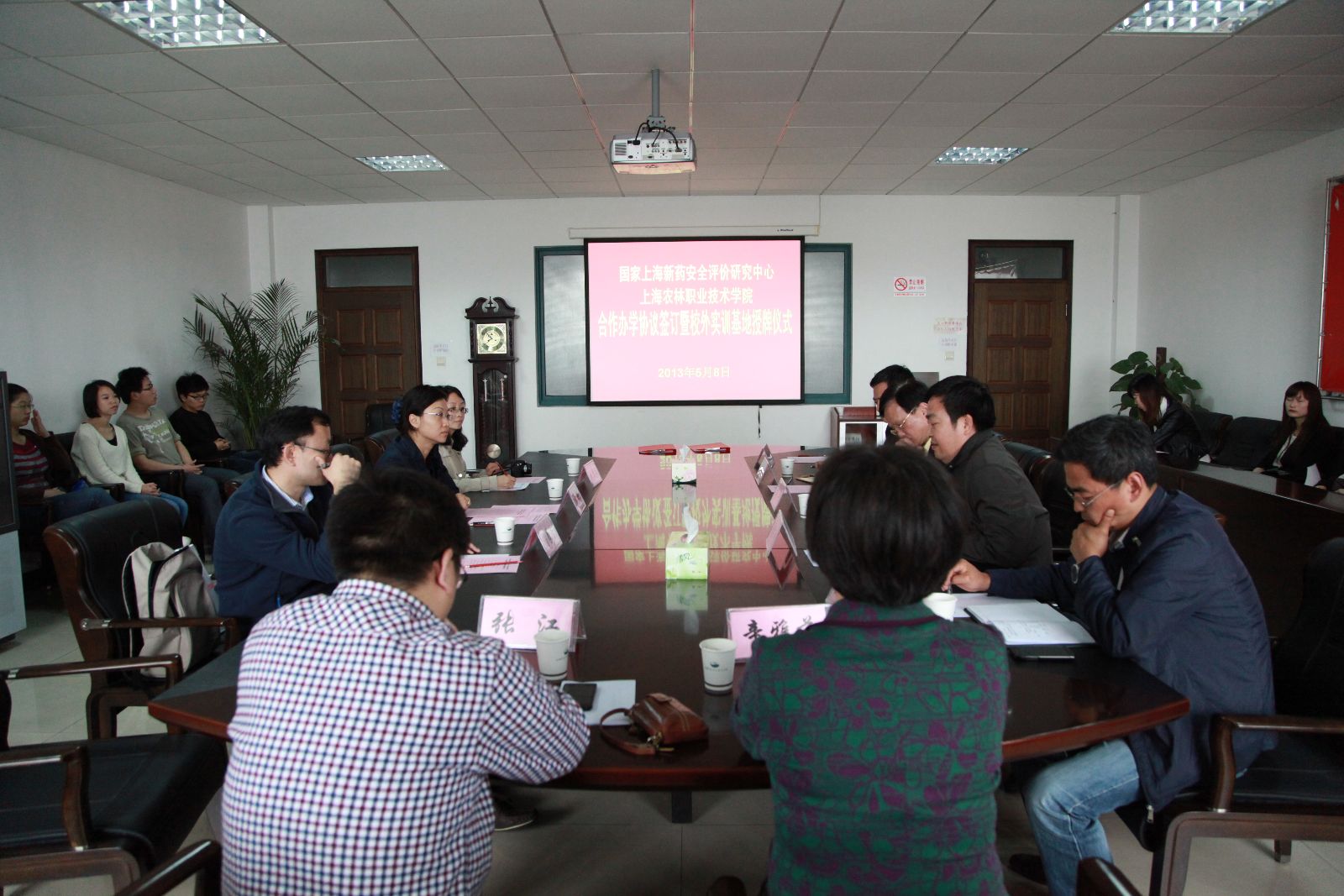 5月8日上午,学院与国家上海新药安全评价研究中心(简称“新药安评中心”)签订合作办学协议暨校外实训基地授牌仪式在学院综合楼1002室举行。院长魏华,副院长谢锦平,副校长黄辉和国家上海新药安全评价研究中心副主任常艳、办公室主任刘戴丽、动物管理部经理潘学营出席,学院教导处、动物科学系负责人及有意向报名“安评班”16名动科系学生参加仪式。会议由校企合作办主任辛雅芬主持。