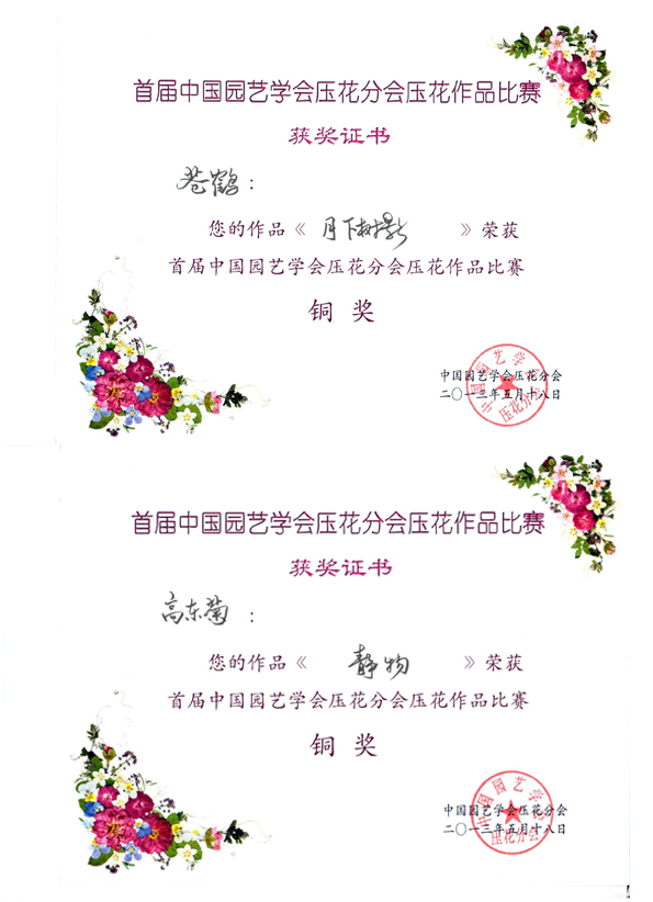 5月18-19日,首届全国压花教学与科研研讨会暨中国园艺学会压花分会成立大会在华南农业大学召开。园艺园林系3名教师参会,并参加了压花作品比赛,获得两项铜奖,作品分别是苍鹤的《月下树影》和高东菊的《静物》。