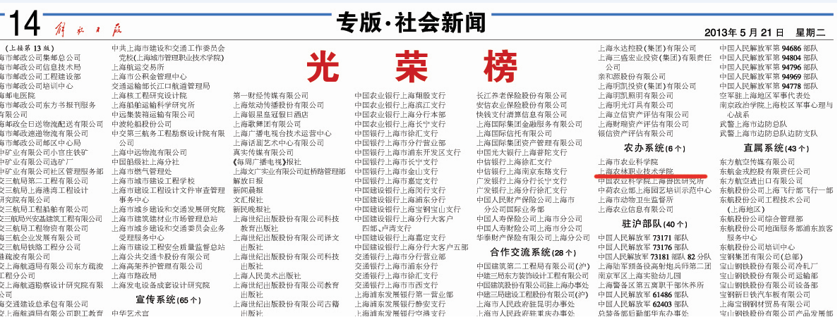 在5月20日举行的上海市2013年精神文明建设工作会议上传来喜讯,学院荣获2011-2012年度(第十六届)上海市文明单位。解放日报在5月21日刊发了光荣榜,学院是市委农办系统6家获评上海市文明单位之一。这是学院自1997年创建上海市文明单位以来,连续16年,第八次获得上海市文明单位称号。