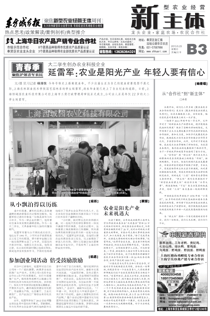 5月23日,东方城乡报B3版专题报道了我院学生延雷军创办农业科技企业。