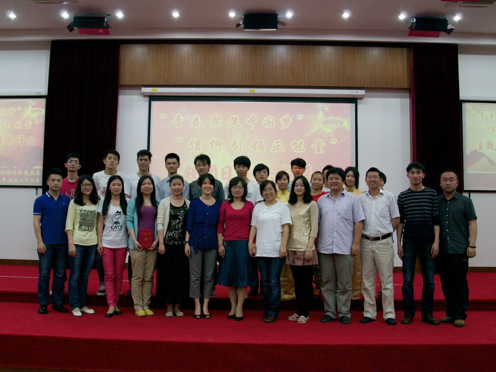 5月22日下午,由院团委主办,动物科学技术系承办的第二十六届“上农之春”文化节系列活动之“青春聚焦中国梦 信仰引领正能量”主题团日展示与评比活动在综合教学楼学术报告厅举行。文化节组委会相关成员和师生代表等200余人参加了活动。