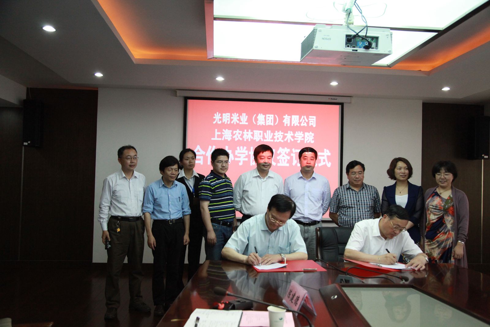2013年6月9日上午,学院与光明食品集团内第三家公司——“光明米业(集团)有限公司”签订“光明米业班” 合作办学协议。光明食品(集团)有限公司农业发展部经理黄超、光明米业(集团)有限公司董事长项竞文、党委副书记叶建东、财务总监杨琴、人力资源部经理吕秀娟、办公室主任郁建忠,学院院长魏华、副校长黄辉出席签约仪式,学院教务处、校企合作办、园艺园林系相关负责人参加。仪式由副院长谢锦平主持。