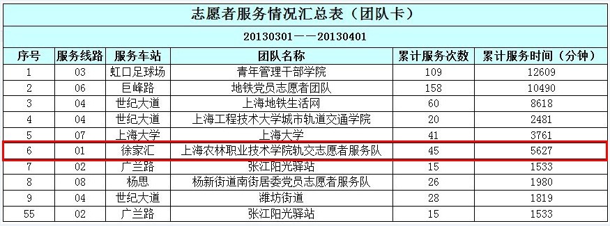 近日,2013年3月份上海地铁持证志愿者排行榜公布于上海地铁网。我院轨交志愿者服务队在1号线徐家汇站以累计服务时间5627分钟,累计服务次数45次,荣登排行榜第四。