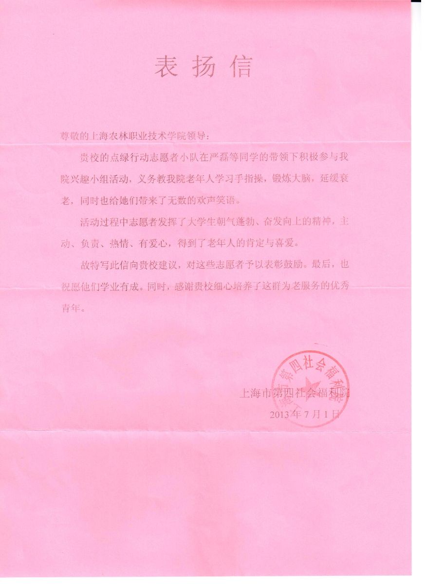 日前,上海市第四社会福利院发来表扬信,表扬园艺园林系点绿行动服务队在严磊等同学的带领下,积极参与福利院老年人手指操活动,与老人面对面、心连心地交谈,给他们带去无数欢声笑语。全文如下: