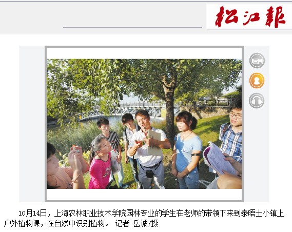 本次实训是一次室外植物观察和标本采集课,专注于听讲的同学吸引了很多市民的注意力,同时也吸引了《松江报》记者的采访。2年前,2011年10月13日发行《松江报》第四版社会新闻中,也以大图形式报道了园艺园林系《园林绿化》课程实训情况。