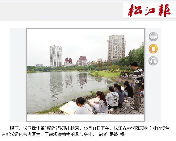 本次实训是一次室外植物观察和标本采集课,专注于听讲的同学吸引了很多市民的注意力,同时也吸引了《松江报》记者的采访。2年前,2011年10月13日发行《松江报》第四版社会新闻中,也以大图形式报道了园艺园林系《园林绿化》课程实训情况。