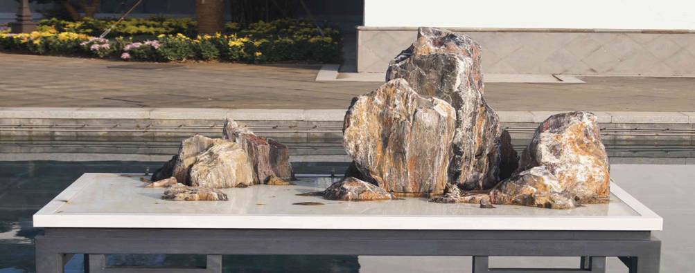 由斧劈石为主要材料组成的水中盆景