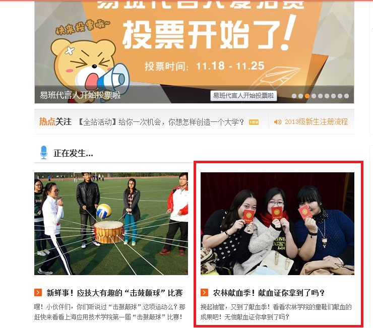 在上海市易班发展中心的关怀和学院易班发展中心的大力支持下,5月底正式加入易班后起步至今,农林易班逐步走上正轨,各项工作和活动也有声有色的陆续展开。自9月份起在全国高校的排名已提升近20名,10月份点击率也提升至第28名,发帖有10篇被选中荣登易班首页。