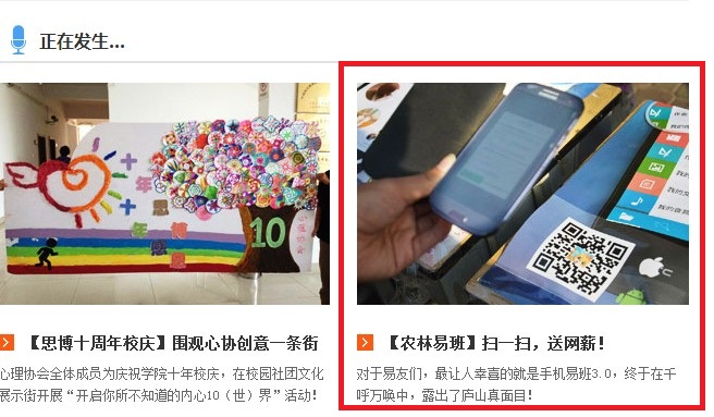 目前,我院自加入易班以来,排名不断提升,在123个高校和单位中目前排名已升至47名,是全站上升最快的高校之一。发帖持续不断的被选中荣登易班首页,包括献血活动、校歌大合唱,“扫一扫,送网薪”,“大声喊出你的爱”等线上线下活动以及同学发表的关于摄影、电脑、软件等专业类的帖子约计10篇,并有数篇帖子推荐为精华,及当选为十大热贴。同时我院易班在易班官方微信平台也频现身影,而且在10月份市易班发展中心的统计显示,我院在全市名高校60多名高校中排至第28名。这些成绩的取得不仅是对我院易班工作的肯定,也为学院赢得了荣誉,在全市高校面前展现了农林风采。