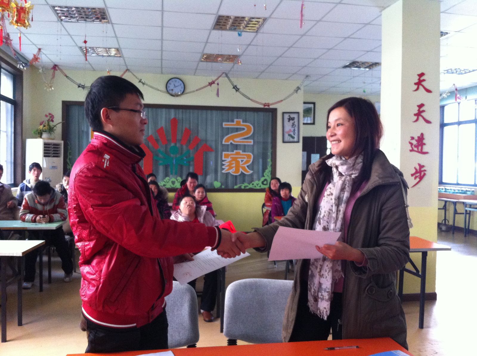 过去的一年里,服务队为智障学员们带来了许多欢乐。同时,他们的专业知识也为“阳光之家”的工作增添光彩。本学期,2013级同学服务热情高涨,服务频率由每周1次改为每周2次,服务质量也再次升级,受到阳光之家学员的欢迎和工作人员好评。签约当天,志愿者为“阳光之家”学员派发了糖果,并进行交流,确定了2014年服务方向。