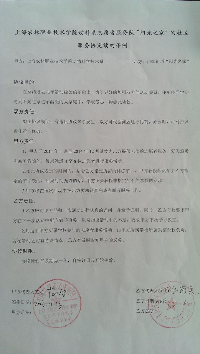 为加强双方合作,日前,我院“阳光之家”志愿者服务队与岳阳街道“阳光之家”在华中公寓续签了2014年共建协议。
