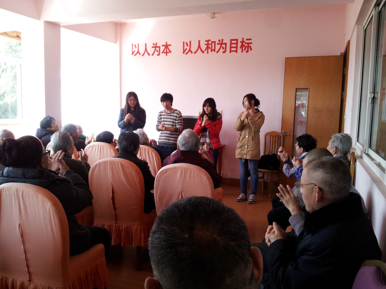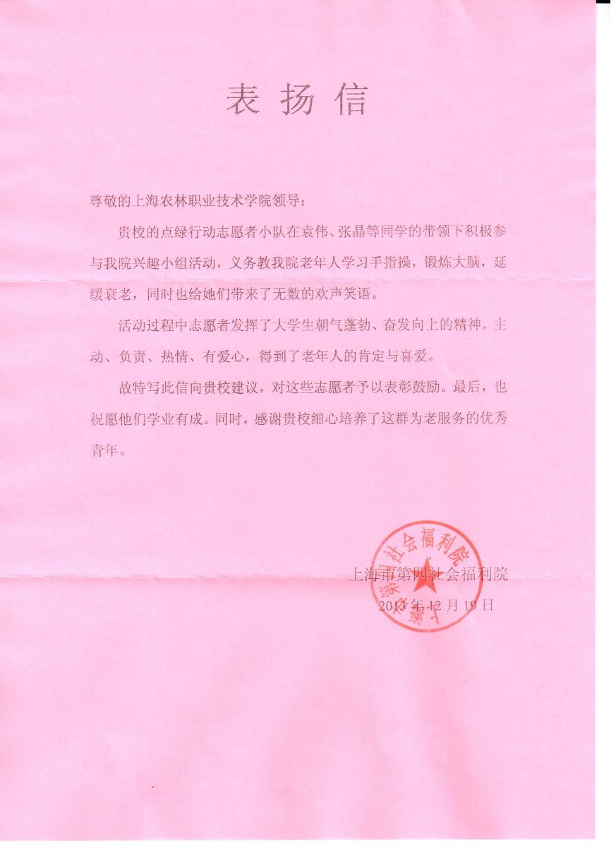 日前,上海市第四社会福利院发来表扬信,表扬园艺园林系点绿行动志愿者服务小队在袁伟、张晶等同学的带领下积极参与福利院兴趣小组活动,义务教老年人学习手指操,给老人带去了无数的欢声笑语。