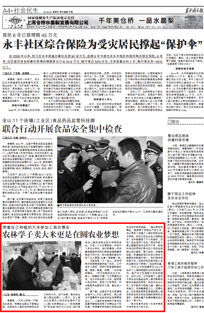 2014年1月9日东方城乡报A4版社会民生转载报道了我院学生延雷军在上海市农博会上卖大米。报道如下: