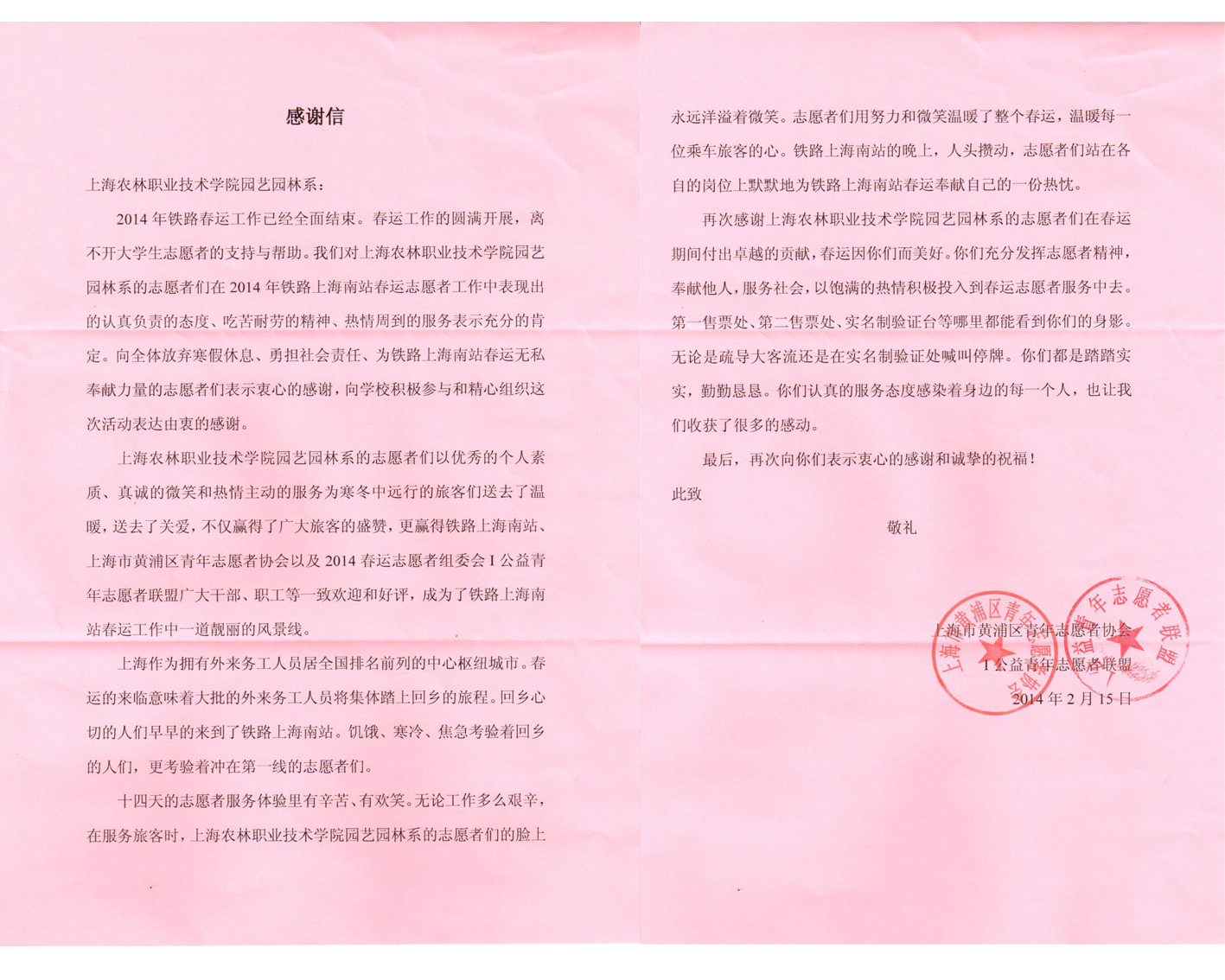 日前,上海市黄浦区青年志愿者协会、公益青年志愿者联盟发来感谢信,感谢我院园艺园林系春运志愿者在春运期间付出的爱心和热情。园艺园林系首次组织志愿者参与上海南站春运工作,在春运期间,志愿者们充分发挥志愿服务精神,以认真负责的态度、饱满的热情积极奉献他人,服务社会。感谢信全文如下: