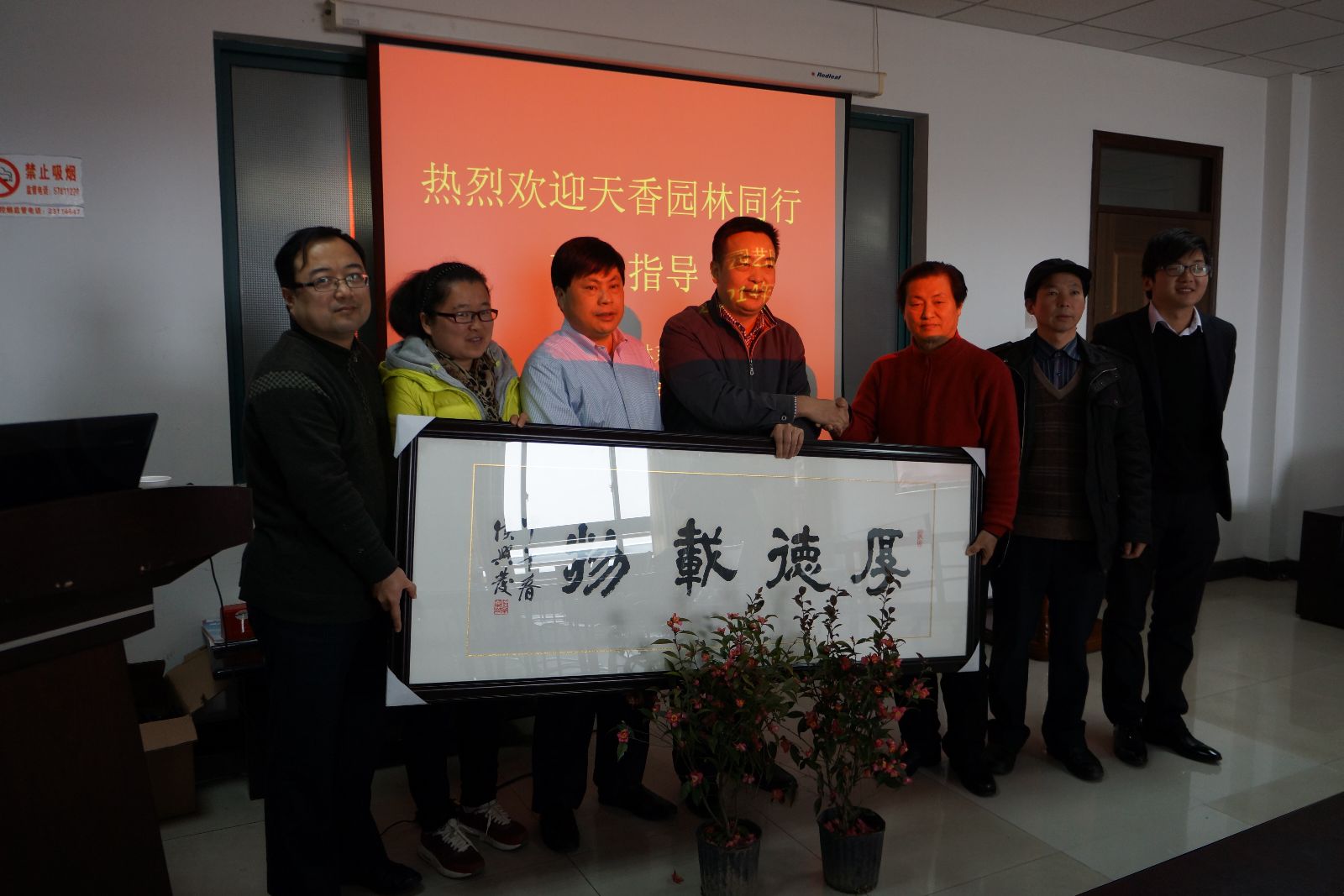 图为天香园林赠与我院园林古建大师侯兴发先生的亲笔题字以及由企业自主培育的新品种红叶茶梅