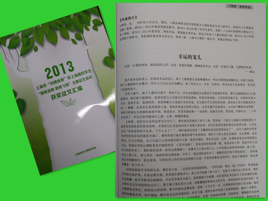 为了大力宣传国家与学校的学生资助政策,挖掘在国家资助政策的支持下,不畏困难、积极进取、奋发学习、自立自强、诚信感恩、成长成才的典型学生案例,全国学生资助管理中心和上海市在2012、2013年连续两年开展了“国家资助助我成长”及“国家资助助我飞翔”征文活动。为配合活动的开展,学院学生处资助管理中心精心组织、有力宣传,首先在校内举行了一次征文活动。活动获得了广大受助同学的热情参与,一些已经校外实习的同学也积极来稿参加。学院在校内评比的基础上,将获奖优秀作品报送至上海市与全国学生资助管理中心,参加更大范围的评选。