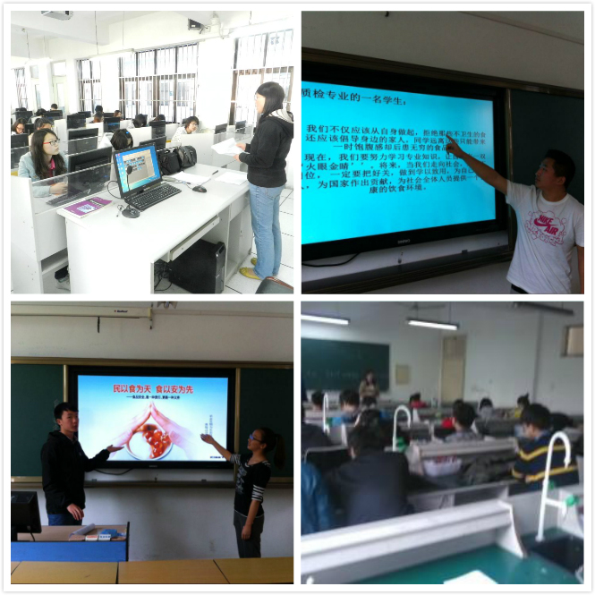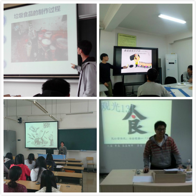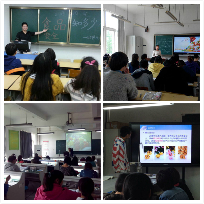 各系精心组织,广泛宣传和动员,师生们围绕饮食卫生、食品安全,广泛收集材料,精心策划,组织了形式多样、内容丰富的主题活动。活动中,班级有的同学通过分享自己贪吃路边摊带来的尴尬经历,“现身说法”揭秘街边小摊、垃圾食品带来的安全隐患,曝光街边“美食”危害健康指数,指出“美食”太可怕,倡导远离小摊回归食堂。有的班级结合热点食品安全重大事故,揭露食品制造工艺黑幕的新闻,以触目惊心的事例解读有害食品带来的重大社会危害。远离有害食品,就得会鉴别有害食品,有的班级通过传授判别有害食品小妙招、购买安全食品小常识等健康小贴士,教大家卫生饮食、健康生活。