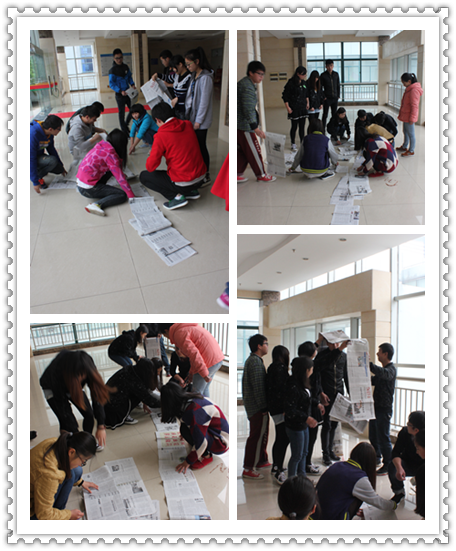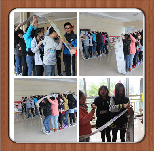最后是“无敌风火轮”。在这个活动中两队成员各自制作了能容纳近十人的风火轮,在整个制作过程中队员们各有分工,配合默契。在比赛过程中,两队员“乘坐风火轮”,一边喊口号,一边朝着终点线滚动纸轮。本次团体活动在互助与协作、欢声与笑语中落下帷幕。