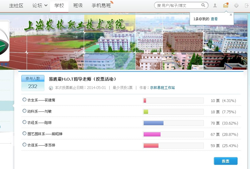 为进一步在老师和学生中宣传易班,建设易班,提升易班使用率,发挥易班在网络思想政治教育中的积极作用,学院易班发展中心将在4月下旬至5月下旬举办“情满农林,易游未尽”易周年庆典系列活动,集中展现我院易班工作站蓬勃向上的精神风貌,有效促进大学生的成长成才。目前,系列活动之一的最HOT指导老师评选活动正在易班网火热进行。