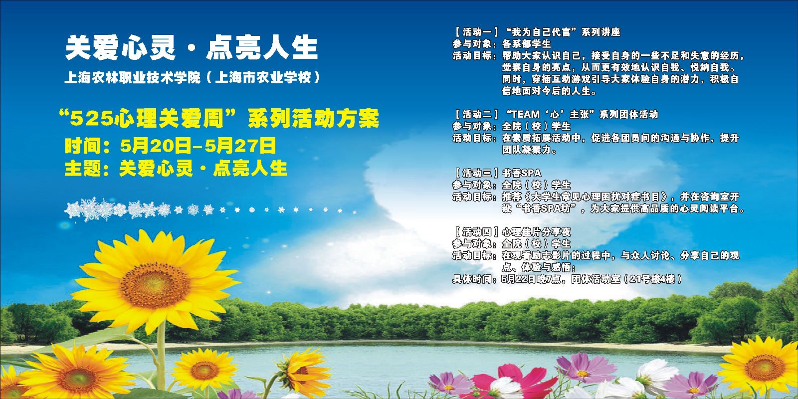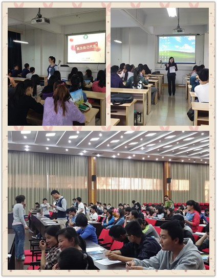我院今年的活动主题是“关爱心灵·点亮人生”,包含“我为自己代言”励志讲座、“Team‘心’主张”团体活动、“书香SPA”心灵阅读坊、心理佳片分享夜,共四大模块的活动。从5月7日起,心理咨询室已经陆续推出了“我为自己代言”励志讲座。