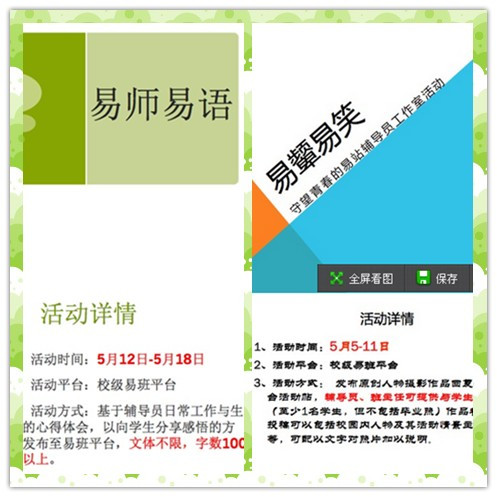 活动于5月4日全线启动,为期半个月,以易班网为活动平台,开展“易颦易笑”、“易师易语”、“易智堂”三个大模块活动。“易颦易笑”活动中,辅导员提供原创师生合影摄影作品,并辅以文字说明,展现各种师生相处的场景和故事。“易师易语”中,辅导员以向学生们分享感悟的方式,将自己日常工作与生活的心得体会发布至易班平台,字里行间,真挚质朴。“易智堂”活动以定时每日一帖的形式进行,通过智力问答等形式帮助老师们放松心情,劳逸结合,更好的投入工作,同时也鼓励和带动老师们更多的关注易班及易班学生动态。