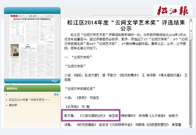 松江区“云间文学艺术奖”是由松江区委宣传部、区文广局、区文联设立并推出的,该奖项的评审活动每年组织一次。今年的评审活动从2014年3月18日发布启事至今,经过评审委员会初评、复评,评选出了3个“云间文学奖”、9个“云间文学奖提名奖”和34个“云间艺术奖”、3个原创舞台剧作品。