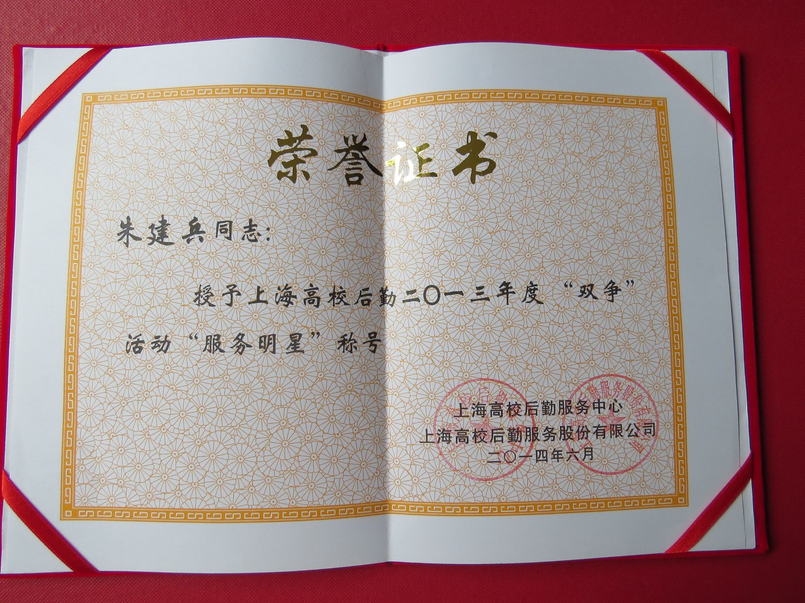 经过“双争”活动评审工作小组研究决定,授予我院后勤餐饮中心荣获上海高校后勤二0一三年度“文明窗口”称号,教工(培训)餐厅主厨朱建兵荣获“服务明星”称号。