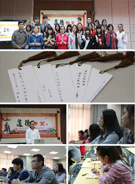 整场讲座贴近学生实际,气氛活跃,互动积极。在问答和讲述间,学生普遍反映对求学有了新的认识,求学应该是终身学习,是人生的一种追求,一种态度,一种状态。在学校里、社会上和生活中,求学无处不在。学习让生活更美好。期间,师生还共同学唱了《公民道德歌》,并在印有道德经的书签上书写了今后求学的座右铭。
