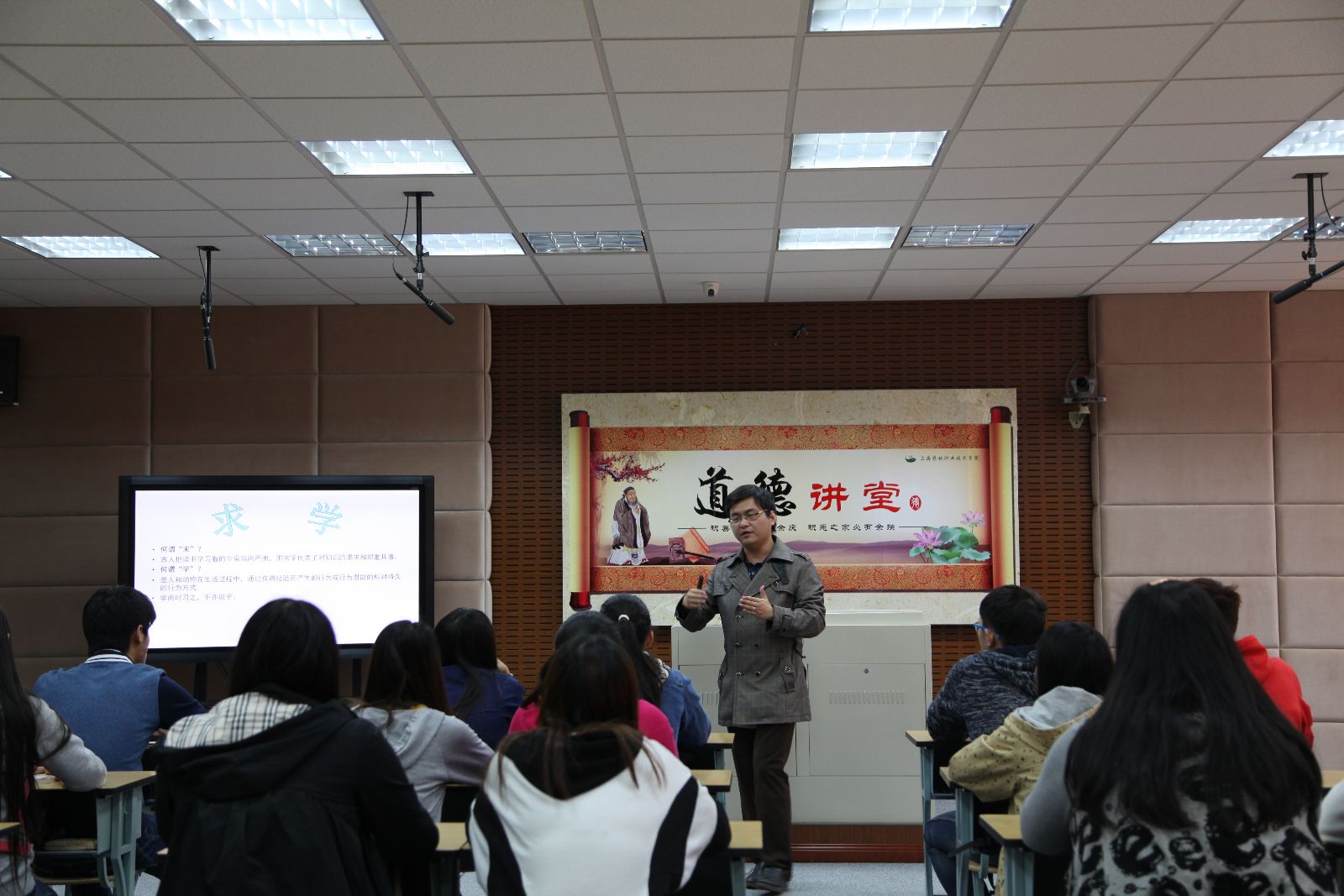 11月11日下午,道德讲堂第九讲在综合楼403录播教室开讲,思政部尹来也老师主讲《求学》,农业经济管理系旅管141班24名同学参与互动。
