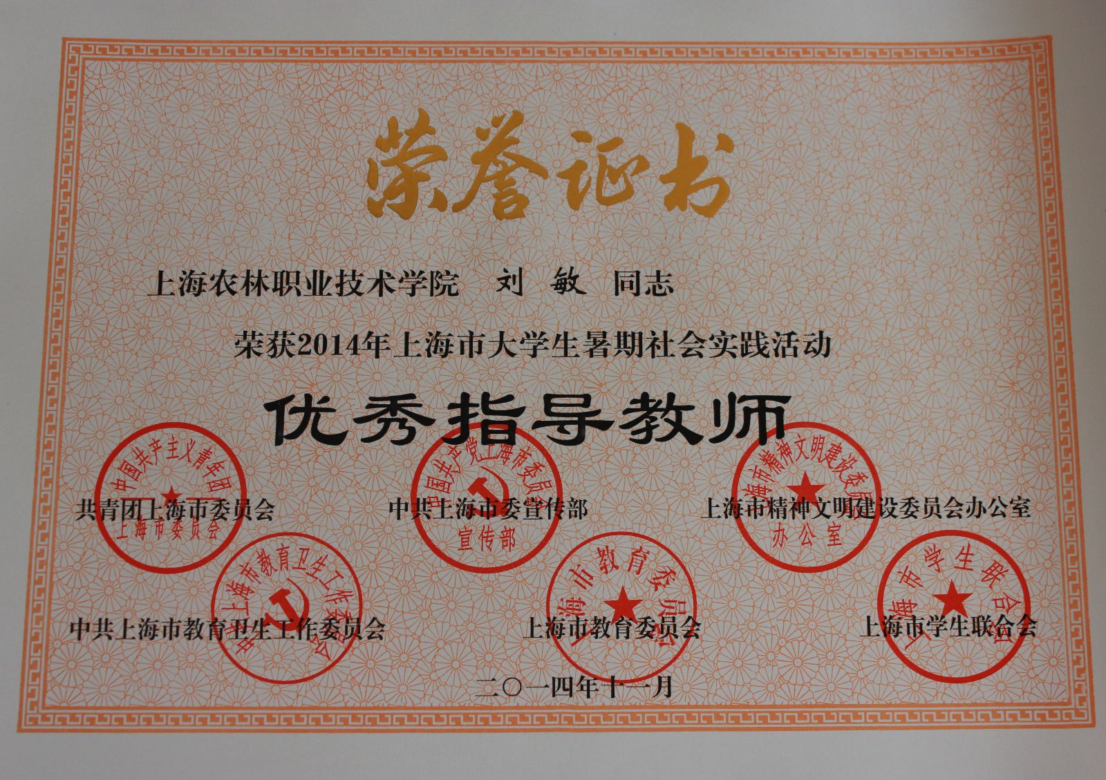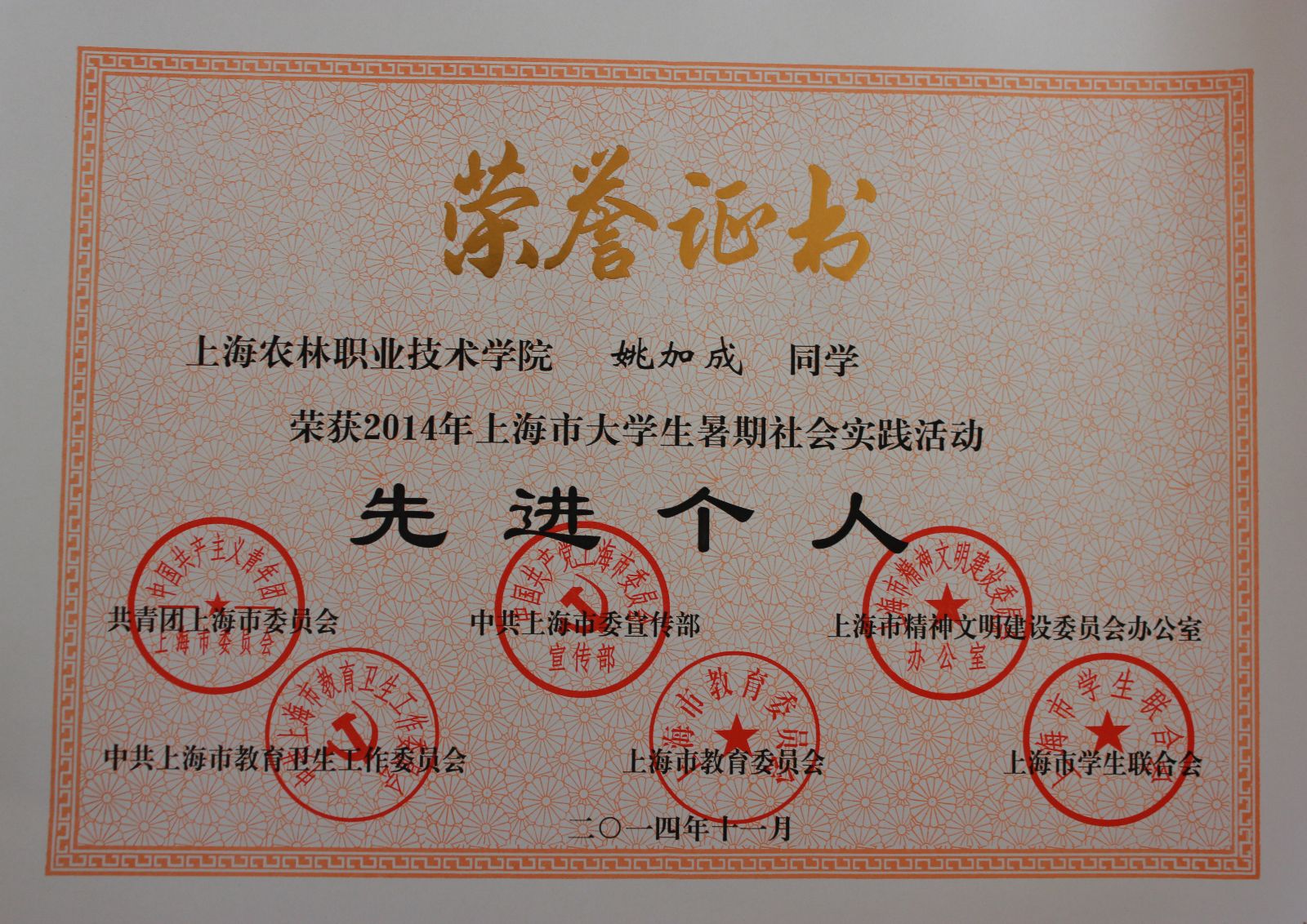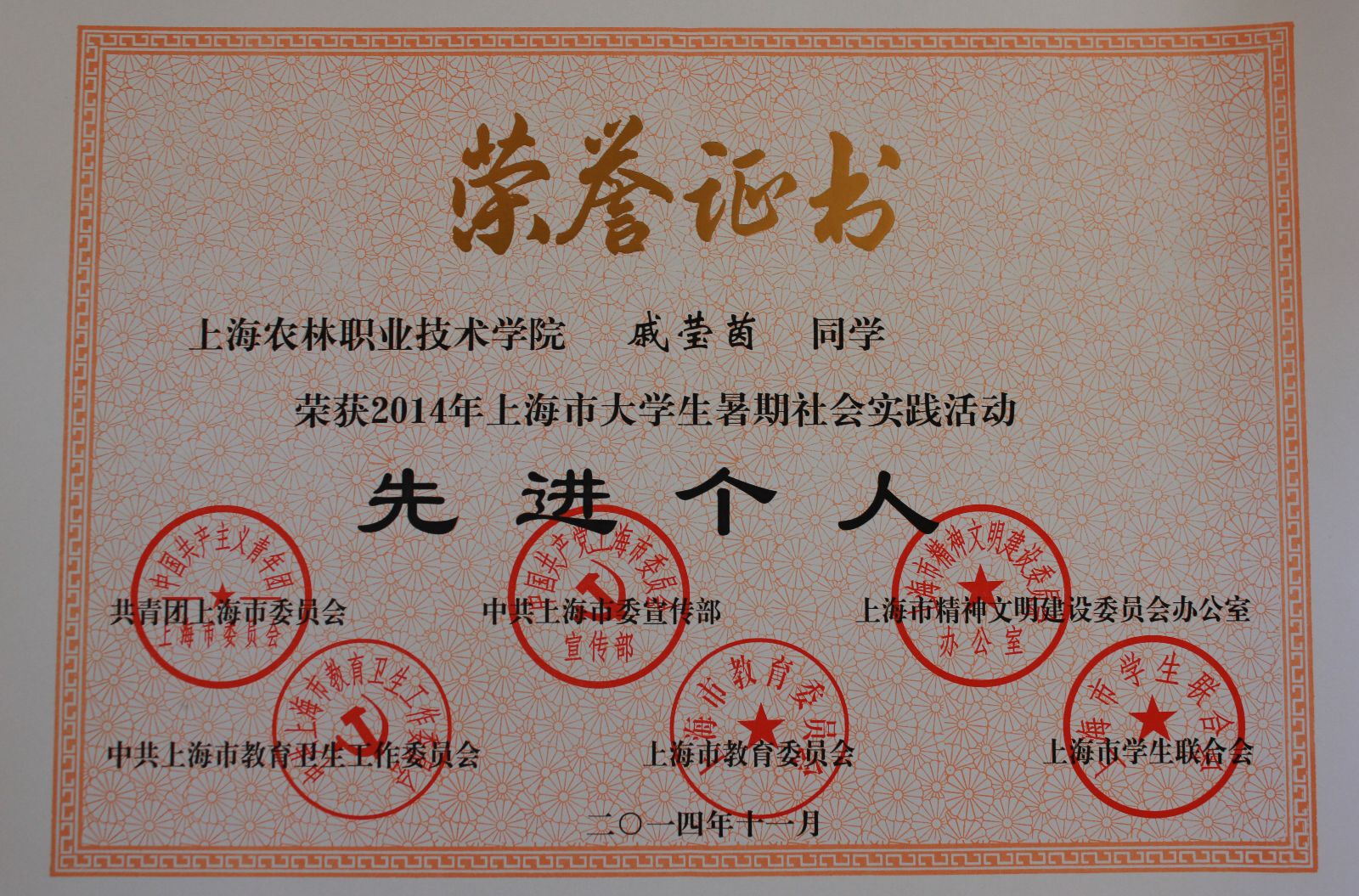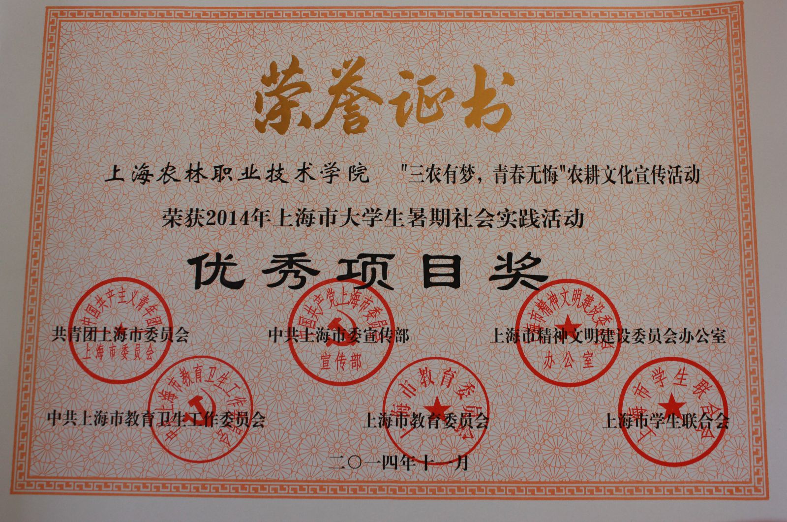 11月19日,2014年上海市大学生暑期社会实践活动总结大会在上海交通大学举行。我院“三农有梦,青春无悔”农耕文化宣传活动荣获2014年上海市大学生暑期社会实践活动优秀项目奖称号,刘敏老师荣获优秀指导教师称号,戚莹茵、姚加成同学荣获先进个人称号。