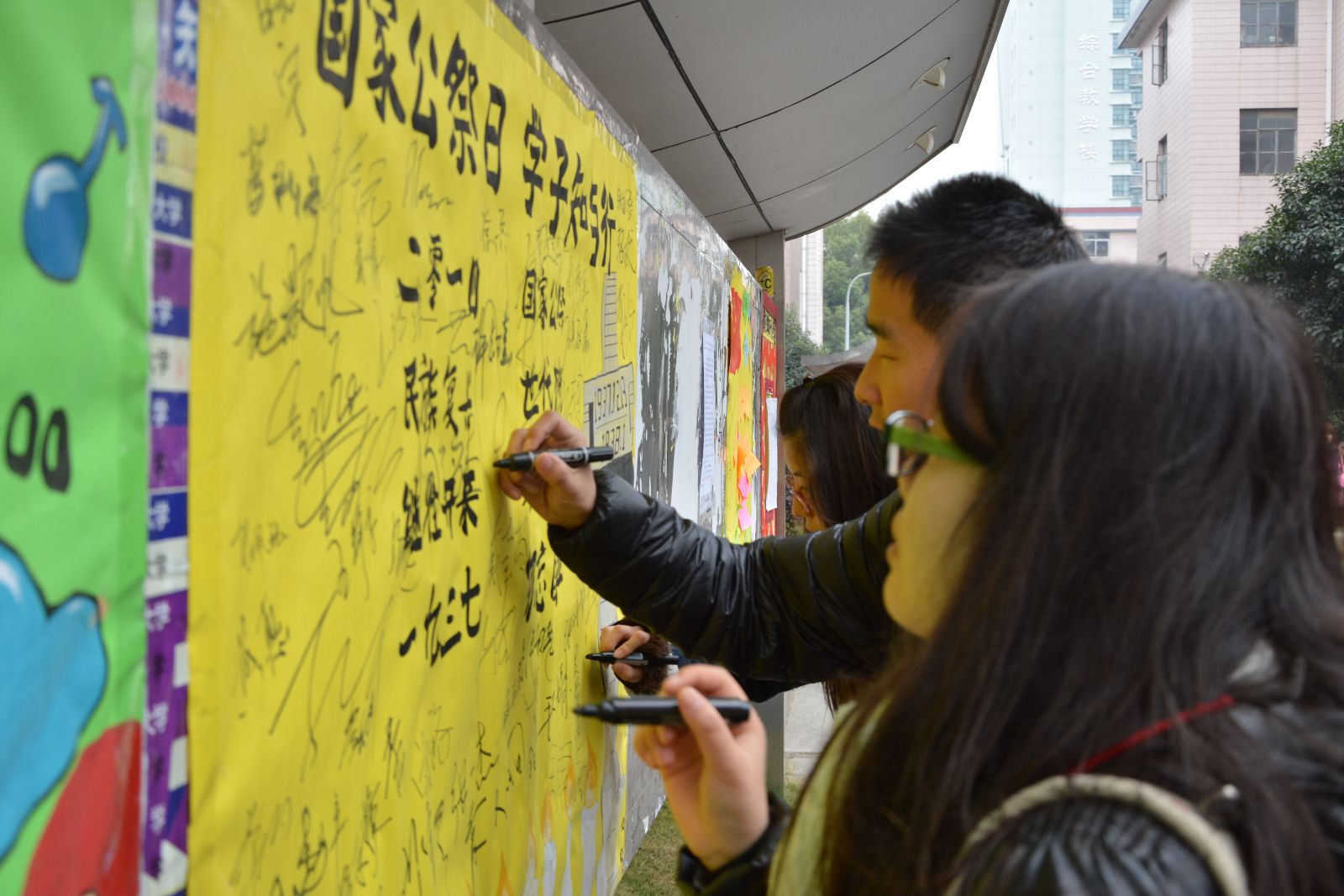 12月15日中午,团委还组织开展了公祭日签名倡议宣传活动,团学干部们向同学们介绍了有关南京大屠杀的史实,并请同学们在宣传海报上签下自己的名字。不少同学都表示要铭记历史,珍惜和平,珍惜现在的美好生活。