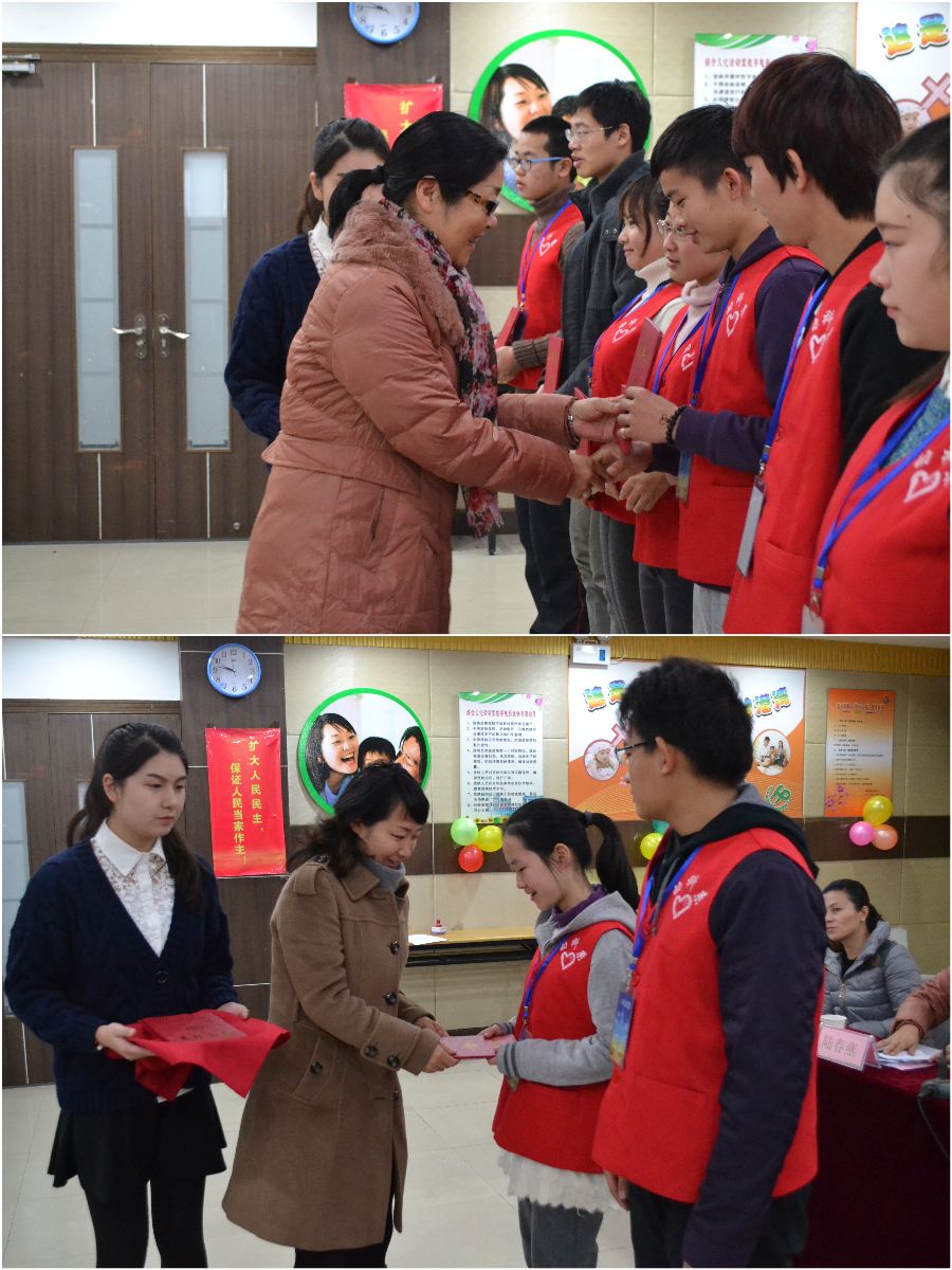随后双方举行了正式的挂牌仪式,刘秀云和陆春燕共同掀开上海农林职业技术学院志愿者服务基地铭牌,为10年如一日的志愿者们和双方成效斐然的合作鼓劲。授牌后对阳光之家2014年优秀志愿者进行了现场表彰和颁奖仪式,共授予12名志愿者上海农林职业技术学院阳光之家志愿服务“先进个人”称号,2名志愿者获得志愿者服务“标兵”称号。获得荣誉的志愿者们不骄不躁,在动物科学技术系志服部部长周琦宝的带领下,12名志愿者当场宣誓,表示将慎终如始、尽己所能、不计报酬、帮助他人、服务社会。他们的精神深深的感动了在场的每一位参加者。