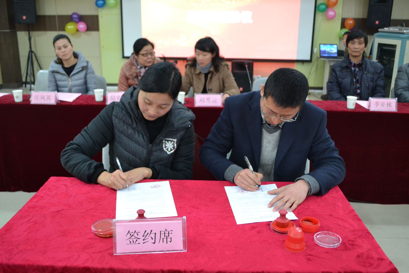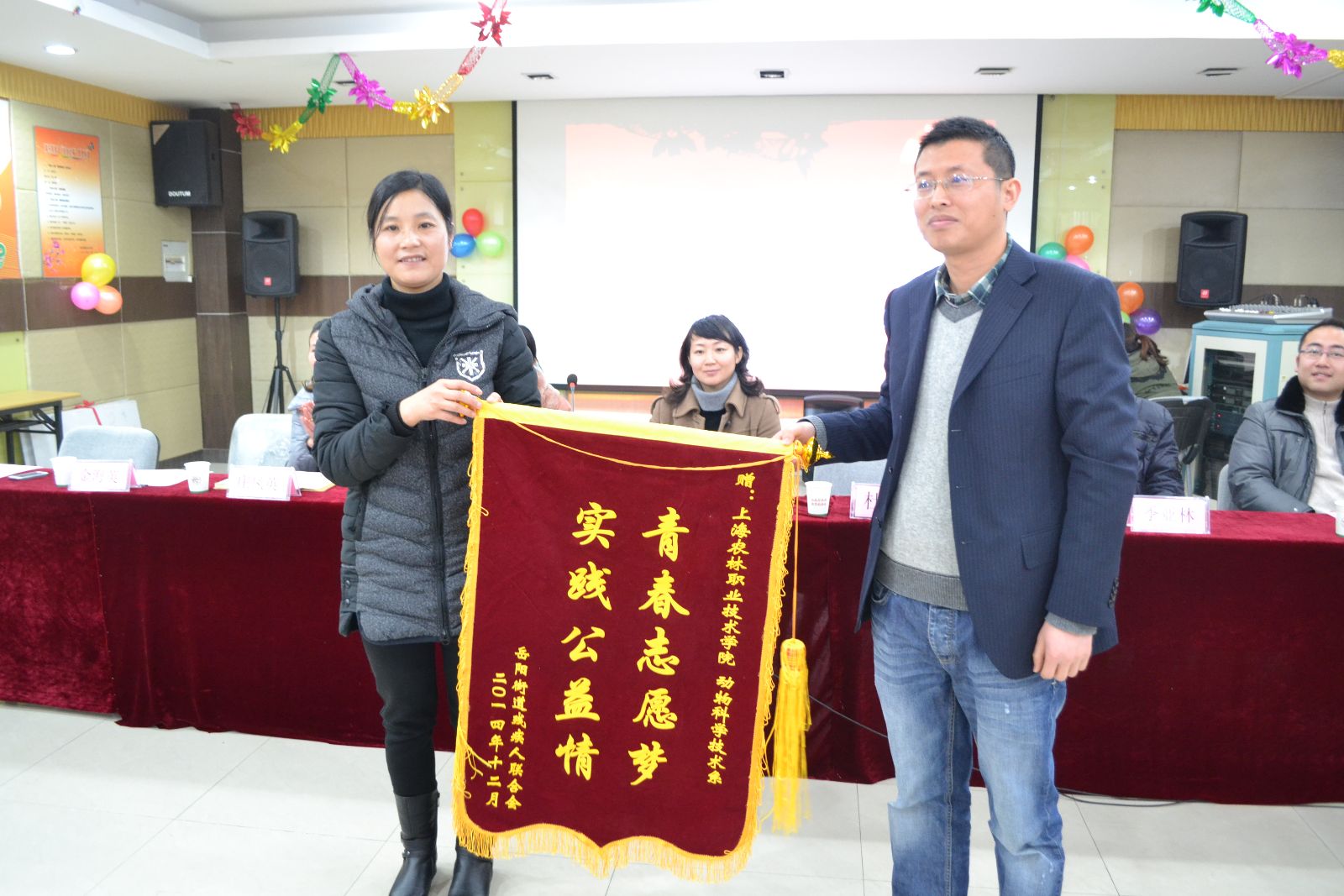 交流发言后,岳阳街道残疾人联合会向我院赠送锦旗,以感谢动科系十年志愿服务路上奉献的点点滴滴。杜波和金海英共同签署了2015年共建协议。
