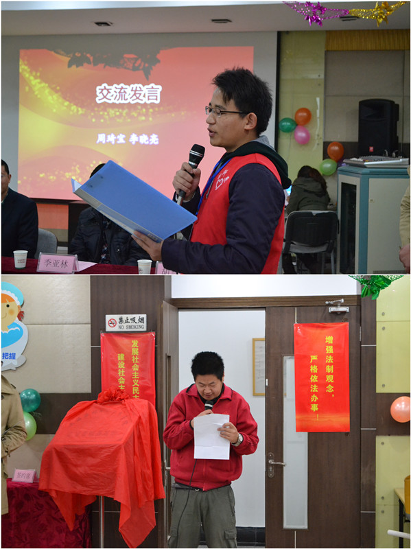 挂牌仪式前,刘秀云、陆春燕、杜波先后发言。刘秀云代表学院、学生处对岳阳街道残联、阳光之家表示感谢,感谢他们为我院志愿者提供了一个施展才华、锻炼能力的社会实践平台,她强调服务基地的建立在形式上是进一步巩固两家单位的合作关系,是对10年志愿服务的肯定,同时也是揭开这项传递爱、传递社会正能力的合作的新篇章。她希望志愿者继续坚定信念、做好示范带领作用,加强自身建设,紧密合作,多途径、创新性的开展更多活动,将志愿者服务永远传承下去。陆春燕对大学生志愿服务给予了高度的评价,并对我院志愿者工作给予了高度的赞扬,感谢我院志愿者10年如一日的付出。杜波认为阳光之家为我院大学生提供了一个优秀的志愿服务平台,并对学生志愿者表示由衷的钦佩和高度的表扬,号召志愿者感染和带动周围更多的人加入到社会公益队伍中。