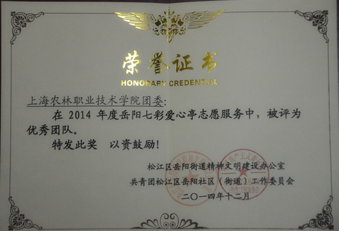 近日获悉,我院团委荣获松江区岳阳街道精神文明建设办公室和岳阳街道团工委颁发的2014年岳阳七彩爱心亭志愿服务优秀团队光荣称号。