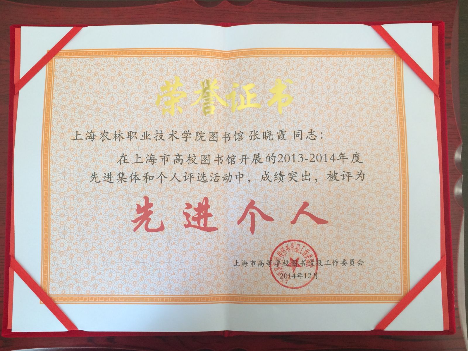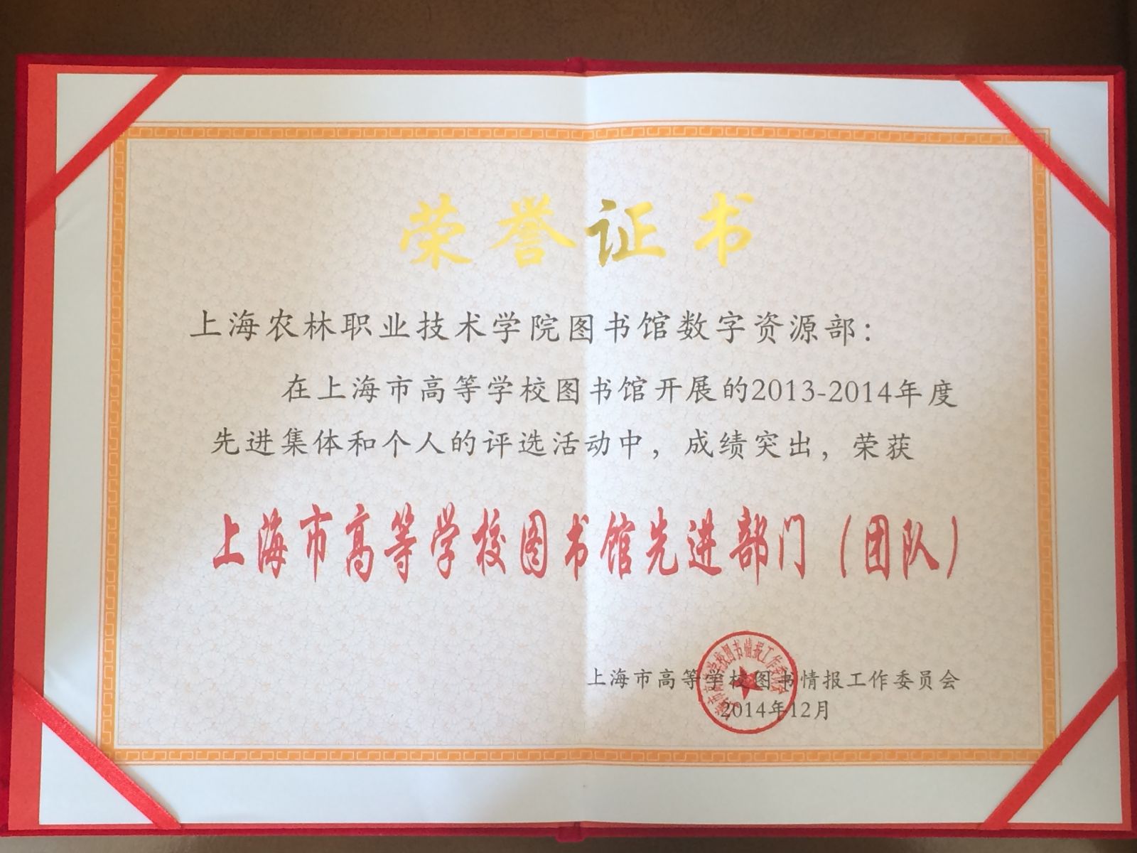 近日,上海市高校图工委召开年度工作会议,表彰和奖励在2013-2014年度本市高校图书馆工作中涌现出来的先进单位和个人。图书馆数字资源部获上海市高等学校图书馆先进部门,张晓霞同志获先进个人荣誉称号。