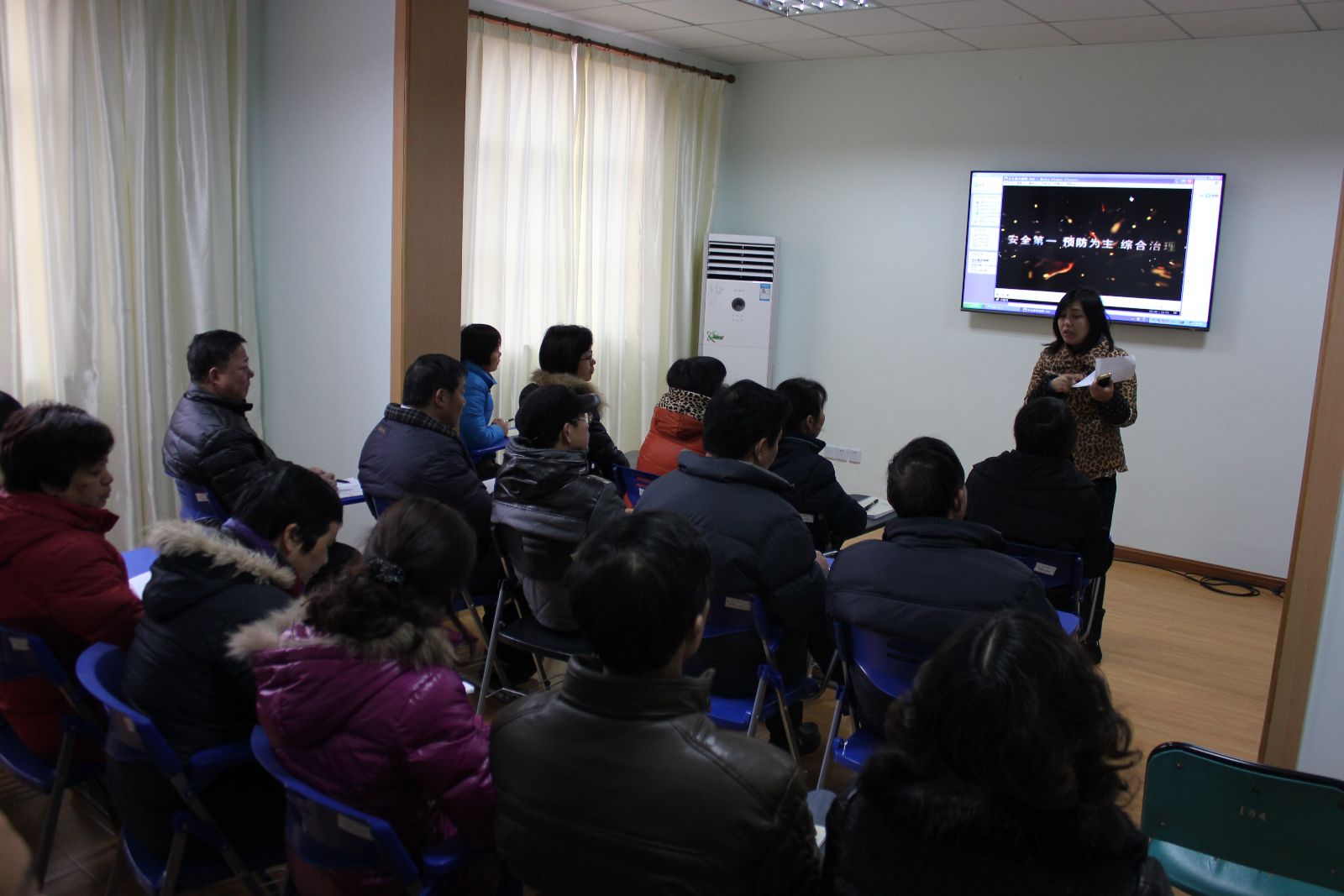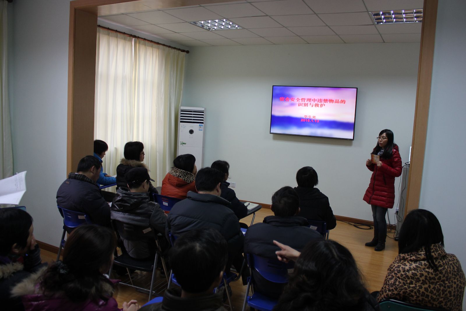 1月13日上午,学生处组织全体宿管员在21号楼404开展安全培训,学生处处长刘秀云、宿管组老师、全体宿管员参加了培训。