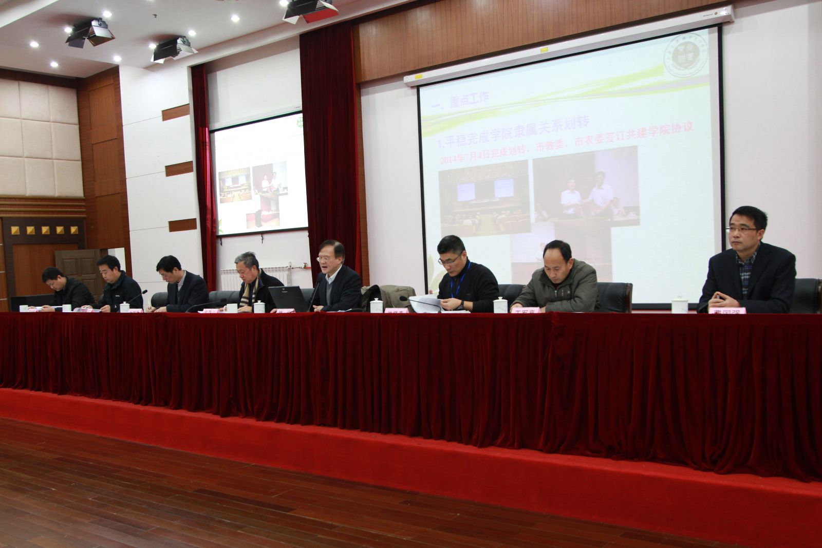 院长魏华在工作报告中指出,2014年学院平稳完成了学院隶属关系划转,全面实施了绩效工资方案,在各项工作中取得了出色成绩。魏华具体部署了2015年工作。重点要全面完成特色校建设任务并做好验收准备,总结特色校建设成果,以优异成绩通过验收。在学院内涵建设方面,要召开第四次教学工作会议,推进实验硬件功能开发,提升实验室管理使用绩效,做好教育教学管理和质量监控、教科研和社会服务、中职内涵建设、招生就业、对外合作交流等工作。在依法治校,提升学院管理水平方面,要加强制度建设和执行力度,提升师资建设水平,启动编制“十三五”规划,做好完善内控体系、财务资产工作、内部审计、后勤保障、校园安全、智慧校园等工作。在党建工作中,要加强思想政治建设,提升班子领导水平,加强干部队伍和基层党组织建设、党的纪律建设,全面落实“两个主体责任”,推进全员育人体系建设,创校园文化品牌,凸显文明创建成果,并做好统战、工会、妇委会和离退休工作。