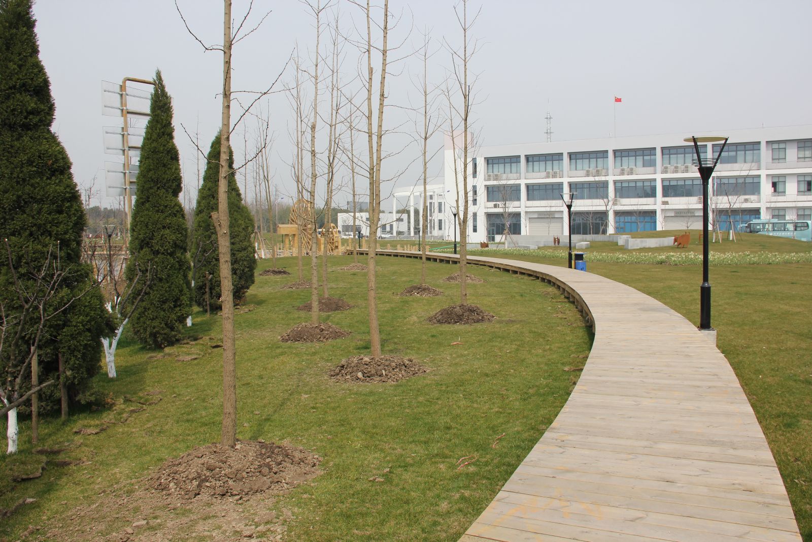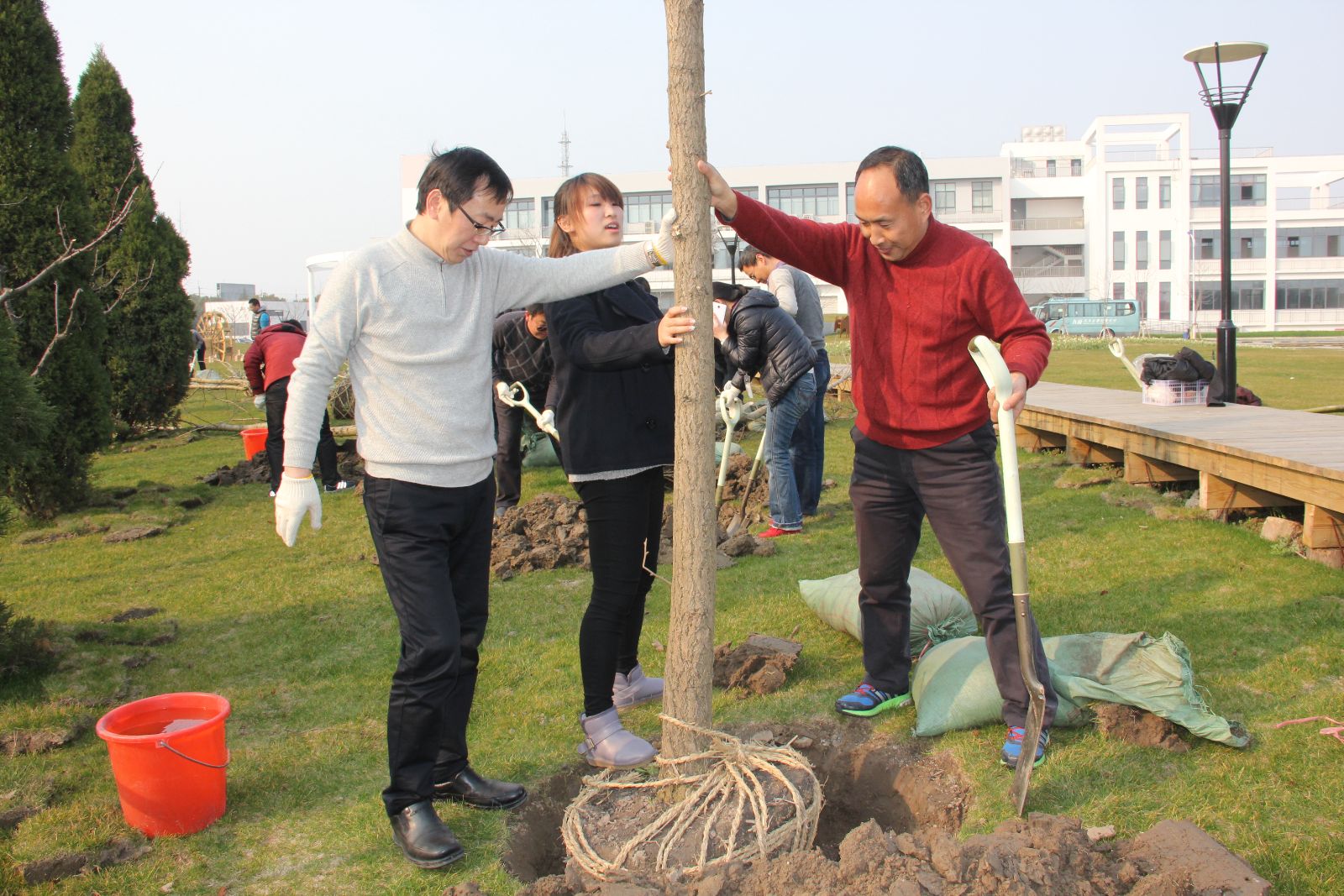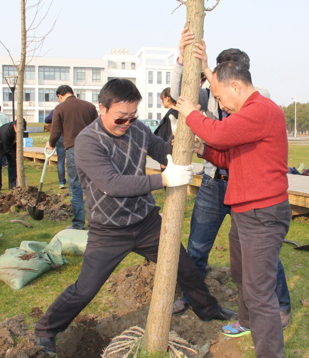 早春3月的实训基地,一派欣欣向荣的景象。在实训大楼南侧的蜿蜒小道旁,大家3人一组按指定的地点开始挖坑植树。经过挖坑、扶苗、培土、浇水等一个多小时的劳动,大家共同种植了16棵银杏树,为实训基地增添了新的绿色风景线。