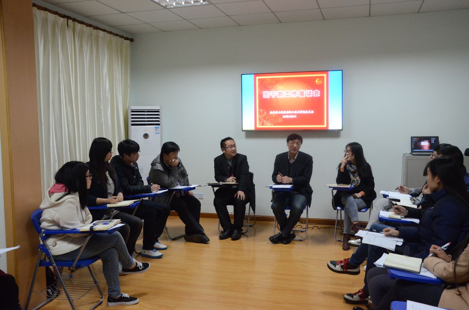 3月17日,团干部在学生事务楼团体辅导室举行座谈会,党委副书记、副院长俞锦禄出席并讲话,团委书记许昊、团委老师和团委各直属部门负责同学参加。