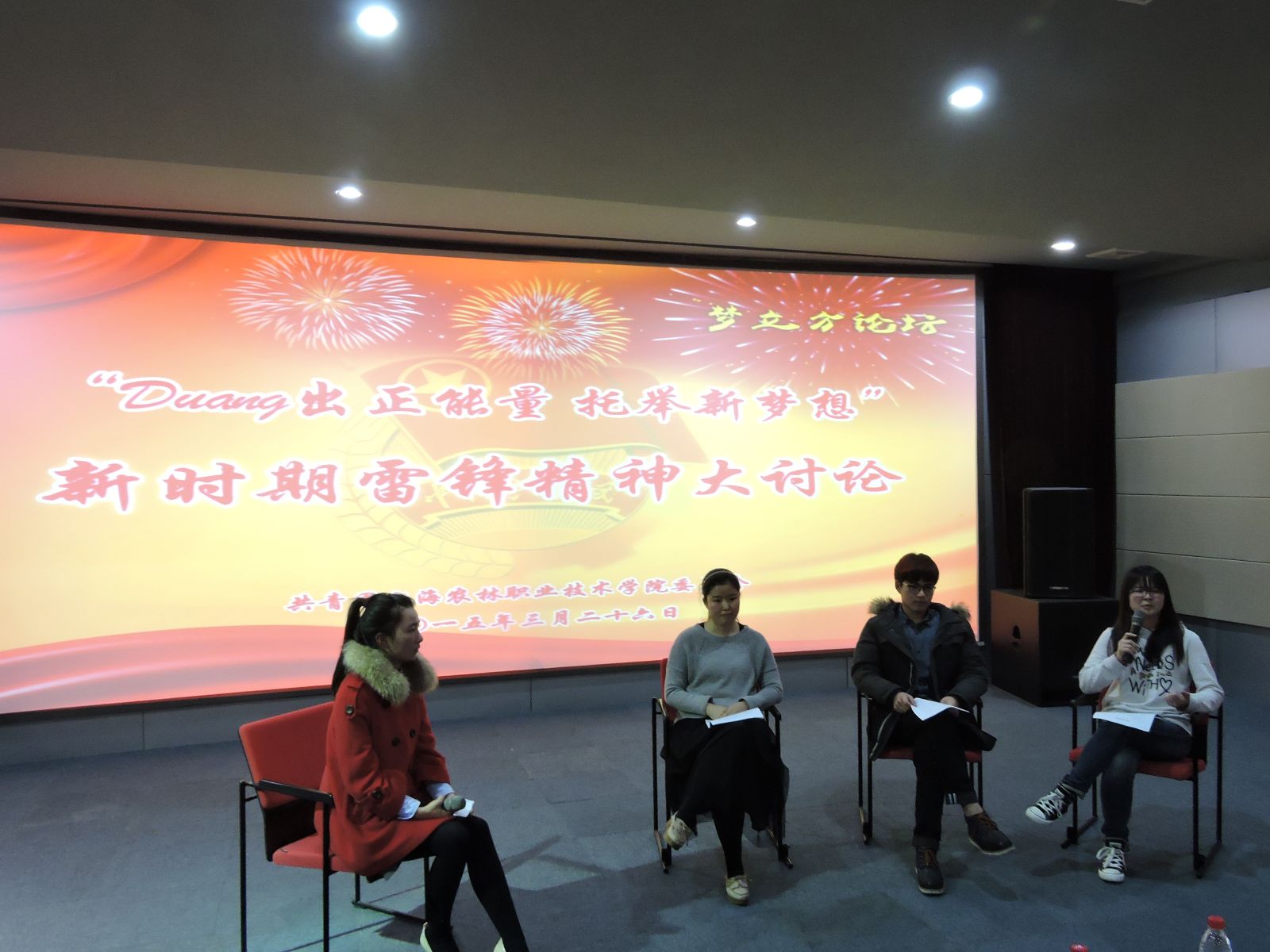 3月26日,院团委在综合楼数字播放厅开展“Duang出正能量 托举新梦想”梦立方论坛活动,团委、思政专业教师、各系团总支和师生代表等共60余人就如何进一步实践、传承、升华新时期雷锋精神展开大讨论。