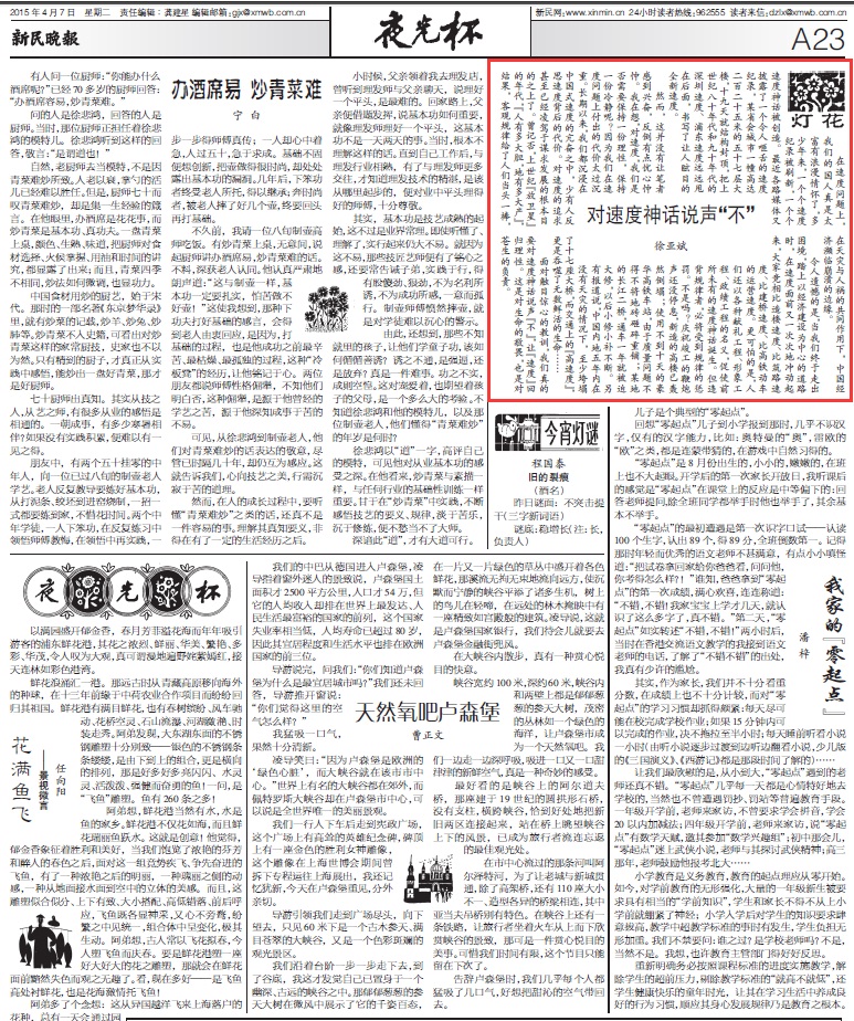 4月7日,新民晚报A23版夜光杯刊登了我院徐亚斌老师的文章《对速度神话说声“不”》。全文如下: