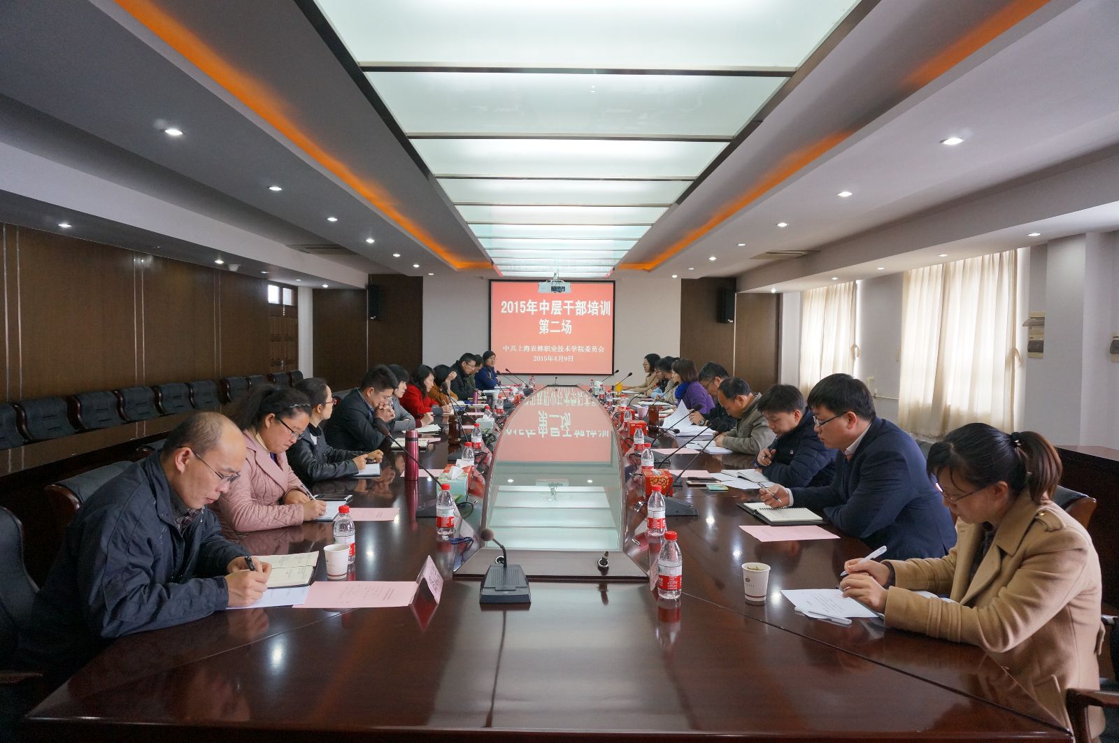 2015年中层干部培训第二场于4月9日在1101会议室举行,副院长仲肇森、农校副校长王军亮出席并做了专题报告。党委组织处处长陈谊主持培训会,全院40周岁以下中层干部共16人参加。