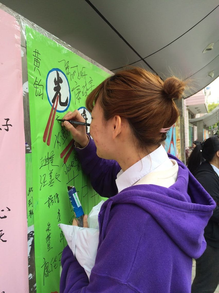 活动中,志愿者们热情地向同学介绍“光盘行动”的意义,倡导大家文明就餐,厉行节俭,杜绝浪费。同学们纷纷在宣传海报上签名,志愿接力成为“光盘”一族,一起来做节约大使。在食堂,志愿者看到有同学送来还剩有饭菜的餐盘时,微笑着告诉他们,吃多少,买多少,节约是一种美德。