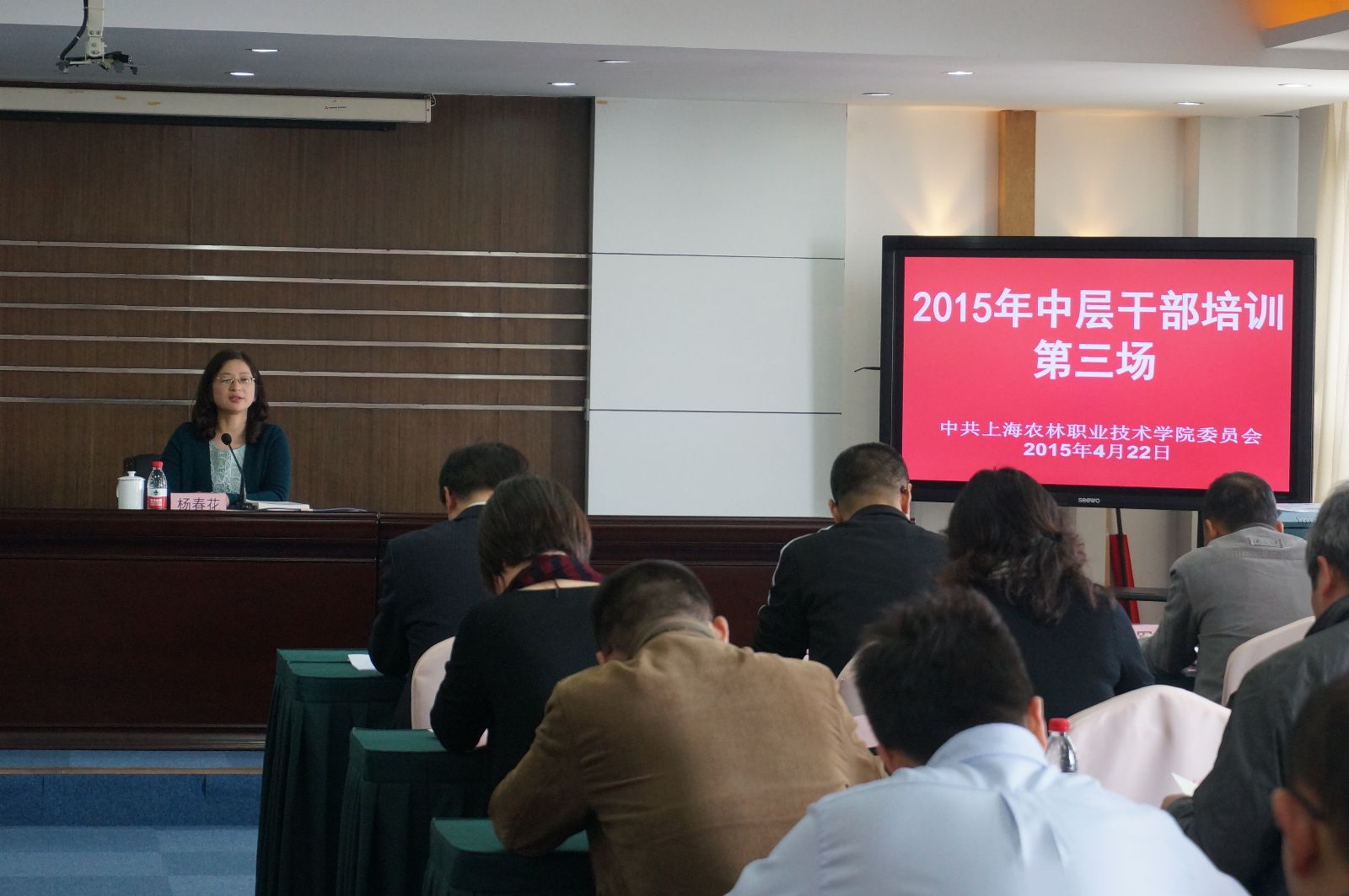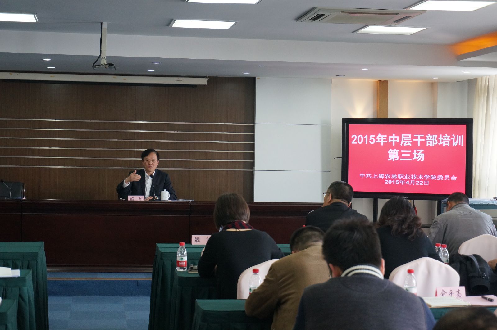 4月22日下午,在综合教学楼1001会议室举行了第三场中层干部培训。上海市农业科学院党委副书记、纪委书记杨春花,院长魏华分别作专题讲座,学院党政领导出席,全体中层干部参加了培训,会议由党委书记吴乃山主持。