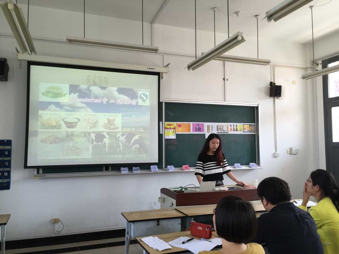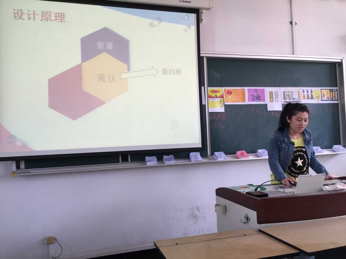 这最后一堂课上,食品131班的十组队员,每一组委派了一名成员以产品营销者的身份介绍了自己的产品,这一刻包含的是每组队员从选定开发方向到功能性食品的市场调查、开发、生产制作、包装、定位的所有心血,他们在其间遭遇过失败,但这已经不重要了。此刻,他们更希望的是产品能够博得同学们的青睐,在随后的使用虚拟货币进行现场销售的环节中,能够被大家需要。