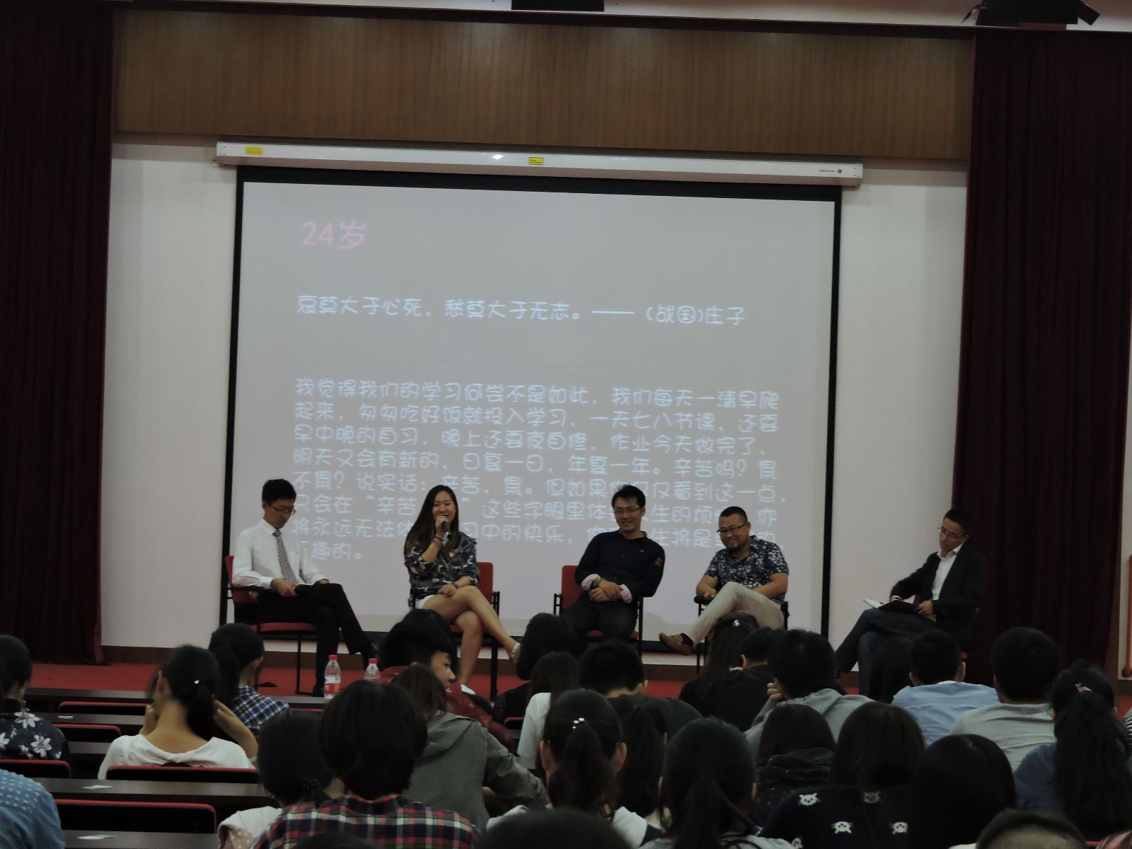 活动第一部分以事迹宣讲为主,现场分享了园林142班徐兵、生物051 班阮斌、动医103班王超和商管052班于葳的青春故事。第二部分以现场访谈的形式进行,动医041班张新怡通过专业学习、工作体验告诉同学们要坚持自己的梦想,为自己的人生梦想努力奋斗;园林113班金沁赟告诉同学们在校期间要不断参加各类活动,积累经验,锻炼自己的综合素质和能力;园林093班蒋正欢和环境112班涂晨阳结合自身创业经历,讲述了自己创业之路中的苦辣辛酸。